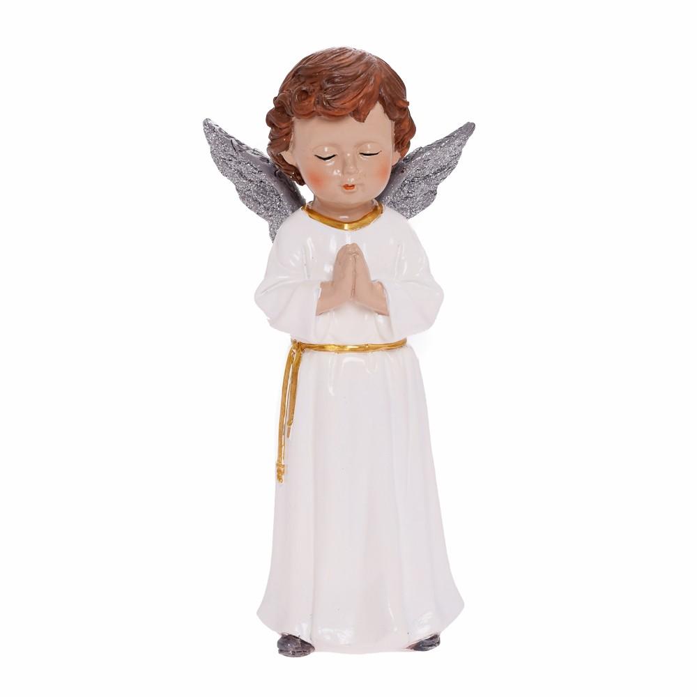 Modliaci anjel je krásna vianočná dekorácia, ktorá dodá vášmu domovu jedinečnú atmosféru. S výškou 20,5 cm a elegantným dizajnom je ideálny na ozdobenie vianočného stola alebo poličky. Anjel je oblečený v bielej róbe s pozláteným páskom a striebornými krídlami, čo mu dodáva na pôvabe. Tento anjel je skvelým darčekom pre vašich blízkych počas sviatočného obdobia.