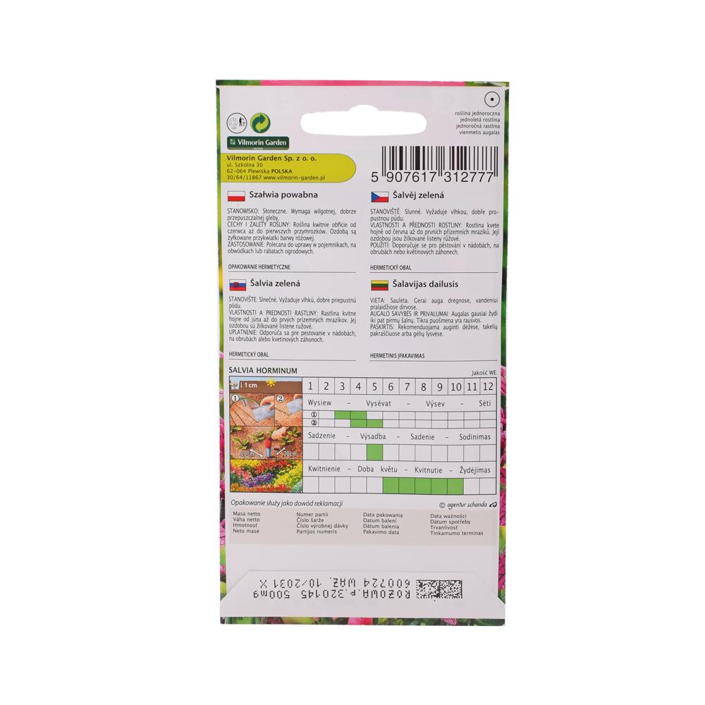 Šalvia zelená je aromatická rastlina, ktorá sa často používa v kuchyni a tradičnej medicíne. Tieto semená sú balené v praktickom obale s hmotnosťou 0,5g. Šalvia je známa svojimi liečivými vlastnosťami a je obľúbená medzi bylinkármi. Vhodná na pestovanie v záhrade alebo v kvetináči.