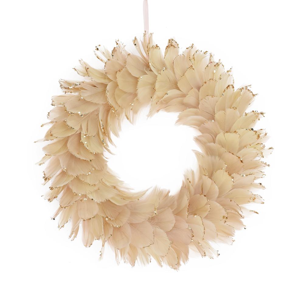 Elegantný veniec z jemných pierok v šampanskom odtieni. Ideálny na dekoráciu dverí alebo stien. Vhodný na rôzne príležitosti, ako sú oslavy alebo sviatky. Jeho nadčasový dizajn dodá každému priestoru šarm.