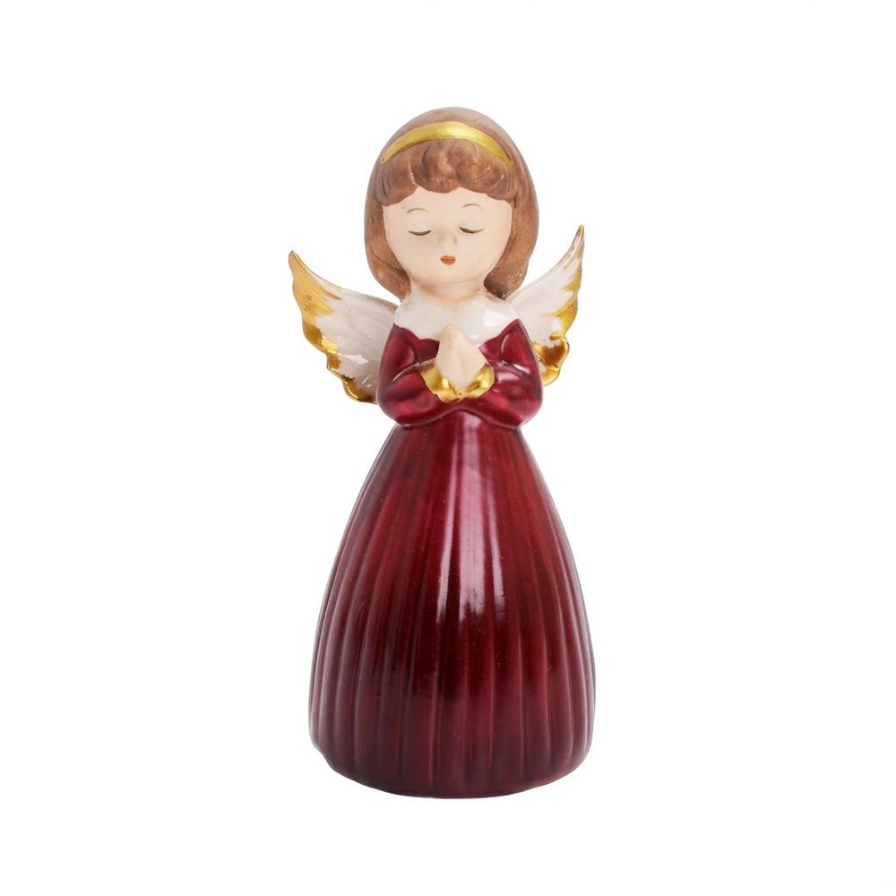 Dekoračný anjel s červeným šatstvom a zlatými detailmi.