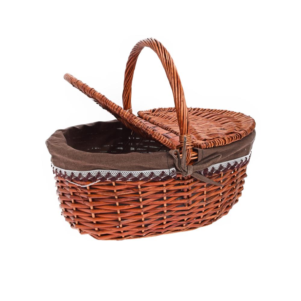 PRÚT. PIKNIKOVÝ KOŠÍK OVÁL TM. HNEDÁ S RÚČKOU TM.HNEDÁ LÁTKA 38x28x17x36CM
